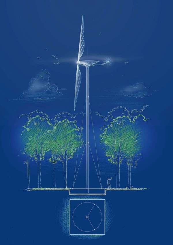 Автор объясняет, что за основу дизайна был взят принцип полета стрекозы. В отличие от стандартных турбин, имеющих три лопасти, в новом прототипе два лопасти, которые в неработающем состоянии располагаются параллельно центральной колонне и минимально заметны в окружающей обстановке. 20-метровая колонна сама по себе очень тонкая – всего тридцать сантиметров в диаметре, потому что сами углеродные лопасти почти невесомые.