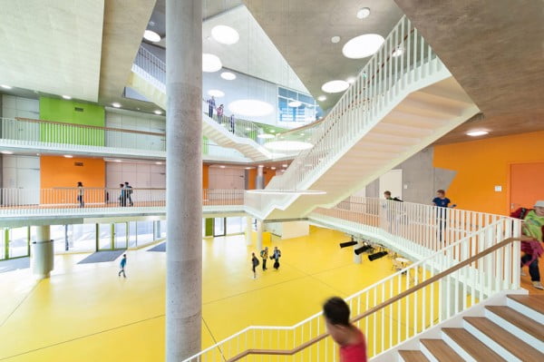 Каждый уголок здания школы специально проектировался максимально гибким и готовым к трансформации, согласно конкретным образовательным задачам. К примеру, общие свободные коридоры могут выполнять функции места неформальных встреч для учеников и учителей, также здесь можно позаниматься как индивидуально, так и в группе.