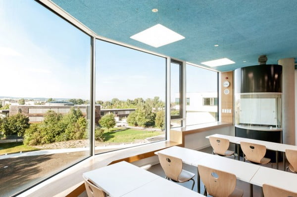 Классные комнаты, расположенные на северной стороне здания, получают дневной свет посредством продуманной системы направления света. Кроме того, использование во всем здании LED ламп позволяет снизить энергопотребление на освещение на 70 % по сравнению с обычными системами.