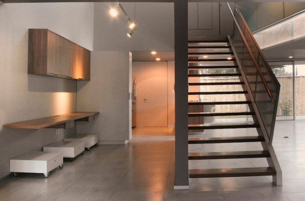 В средней секции дома расположилась деревянная лестница, соединяющая общее пространство первого этажа с парой спален на этаже втором.