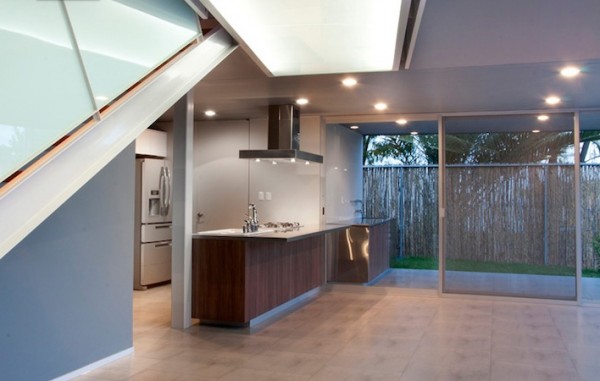 В соответствии с пожеланиями владельцев дома, которым особенно хотелось получить располагающий к общему времяпровождению проект, нижний уровень намеренно имеет открытую планировку с огромными прозрачными стенами, которые в любой момент можно раздвинуть, выходящими прямо во внутренний сад.
